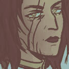 ⠀ HAIR ⠀⠀Thigh length. Straight and thick. Styled in a beehive that is segmented and protrudes upwards. Light brown.⠀ EYES ⠀⠀"Ice" blue. Upturned, sharp crease. 'Fox-like' in shape with long eyelashes.⠀ COMPLEXION ⠀⠀Fair skin. Pink undertones. Easily becomes washed out.⠀ TATTOO(S) ⠀⠀Parallel bars tattooed on his nose, chin, and forehead. Sky blue fill.⠀ HEIGHT ⠀⠀6'1 ft [ 185 cm ]⠀ WEIGHT ⠀⠀155 lbs [ 70 kg ]⠀ BUILD ⠀⠀Ectomorph. Lean, toned.⠀ USUAL FACE LOOK ⠀⠀Calm and thoughtful. Notably cold and cunning eyes.⠀ USUAL CLOTHING ⠀⠀Wears a bluish vest over a black turtleneck, with a double layered heart symbol in the chest area. Outfit accompanied with a pair of earrings shaped into the letters T and D.